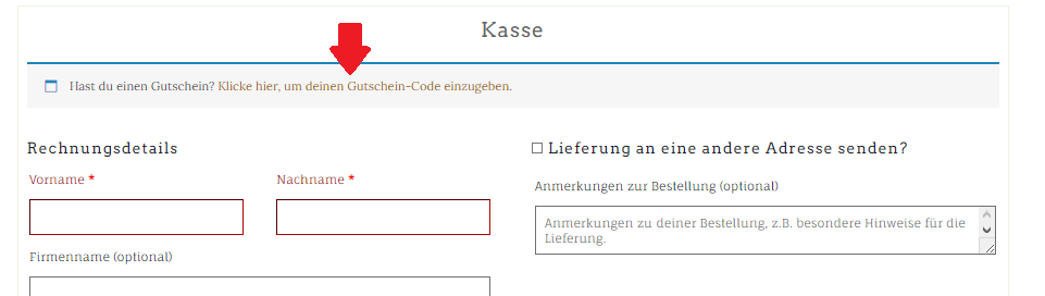 Im Onlineshop könnt ihr den Gutschein einlösen, sobald ihr zur Kasse geht. Direkt ganz oben im Kassenbereich wird euch ein Hinweis angezeigt, den ihr anklicken müsst. Danach kann der Gutscheincode eingegeben werden und der Gutscheinbetrag wird vom Warenwert abgezogen.
