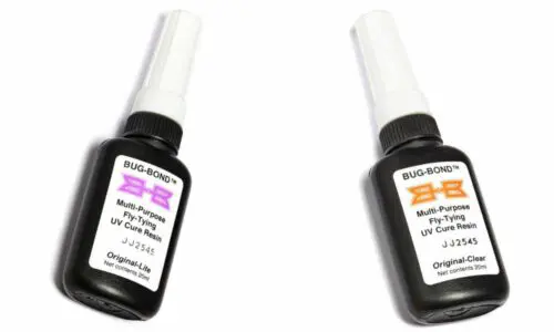 BUG-BOND ist ein sehr bekannter und in der Fliegenbinderszene etablierter UV-Lack, der sich kinderleicht mit einer UV-Lampe aushärten lässt. UV-Lack wird z.B. benutzt um 3D-Augen, oder Stick-on-Eyes bei Baitfischmustern einfach und haltbar anzubringen. Man kann auch komplette Streamerköpfe mit dem UV-Lack formen, oder ihn für Rückenpanzer von Bachflohkrebsen und Nymphen verwenden. Sollte der UV-Kleber + UV-Lampe nicht ins Budget passen, empfehlen wir als etwas schwieriger zu verarbeitende, dafür aber deutlich günstigere Alternative Quick Set Epoxy. BUG-BOND Original: Die Viskosität des UV-Klebers entspricht etwa die von flüssigem Honig und lässt sich einfach auftragen. BUG-BOND Lite: BUG-BOND Lite ist flüssiger als BUG-BOND Original und kann gut verwendet werden, wenn der UV-Kleber z.B. in Material einziehen soll, oder der Kleber als Lackersatz verwendet wird.